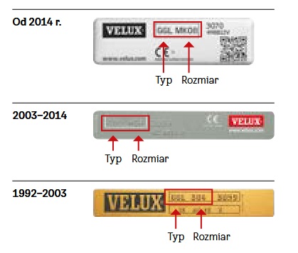 Tabela pomocnicza dla oznakowań okien dachowych VELUX w/g wymiarów dla poszczególnych dat produkcji.
