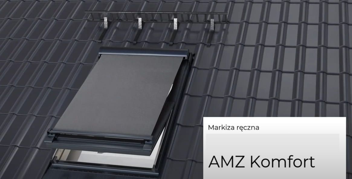 Markiza AMZ Komfort to eleganckie i funkcjonalne rozwiązanie do okien dachowych, które zapewnia doskonałą ochronę przed nadmiernym ciepłem słonecznym. Zamontowana na zewnątrz, absorbuje promieniowanie słoneczne już przed szybą i emituje ciepło na zewnątrz, skutecznie chroniąc wnętrze przed upałem, jednocześnie umożliwiając zachowanie widoczności na zewnątrz. Dzięki temu użytkownik może cieszyć się widokiem oraz komfortem przez cały rok. Markiza sterowana ręcznie za pomocą dłoni lub drążka o długości 80 cm (w zestawie) jest wygodna i łatwa w obsłudze.