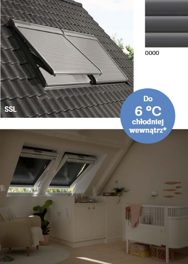 Solarna termoizolacyjna aluminiowa roleta zewnętrzna SSL zapewnia najlepszą osłonę termiczną, całkowite zaciemnienie i komfort w każdych warunkach pogodowych. Obsługiwana od wewnątrz, wytrzymała aluminiowa osłona blokuje ciepło i światło, zapewniając chłodne i ciche pomieszczenie. Idealnie pasuje do okien dachowych VELUX bez konieczności prowadzenia przewodów, zapewnia dobrą ochronę przed warunkami pogodowymi.
