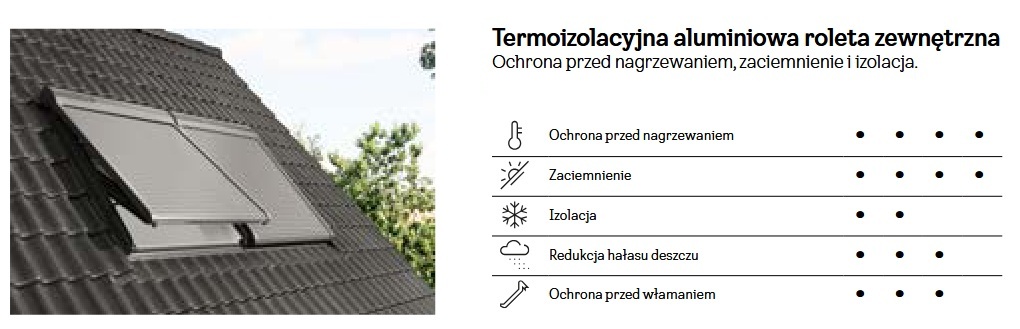 Przejmij pełną kontrolę nad komfortem w swoich wnętrzach dzięki aluminiowym roletom zewnętrznym VELUX — to idealny wybór zapewniający kompleksową ochronę przez cały rok. Roleta zapewnia doskonałą ochronę termiczną, zaciemnienie i redukcję hałasu. Pancerna warstwa zewnętrzna zbudowana jest z aluminium i zapewnia odporność na włamanie i izolację termiczną.
